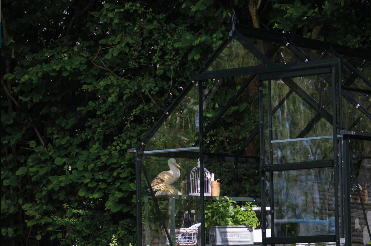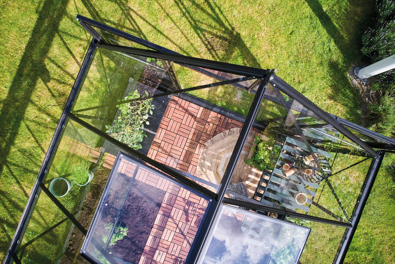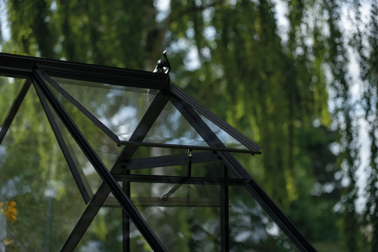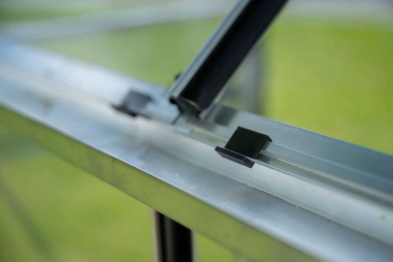 Konstrukcja szklarni wykonana jest z aluminium oraz wypełniona szkłem hartowanym o grubości 3 mm co gwarantuje trwałość, bezpieczeństwo i estetyczny wygląd na długie lata. Szyby mocowane są na gumowych uszczelkach oraz przypinane plastikowymi listwami. Profile aluminiowe malowane proszkowo na elegancki czarny kolor sprawiają, że szklarnia prezentuje się nowocześnie i doskonale komponuje się z otoczeniem ogrodu.