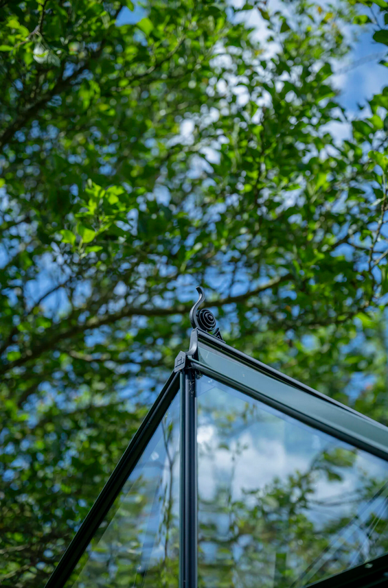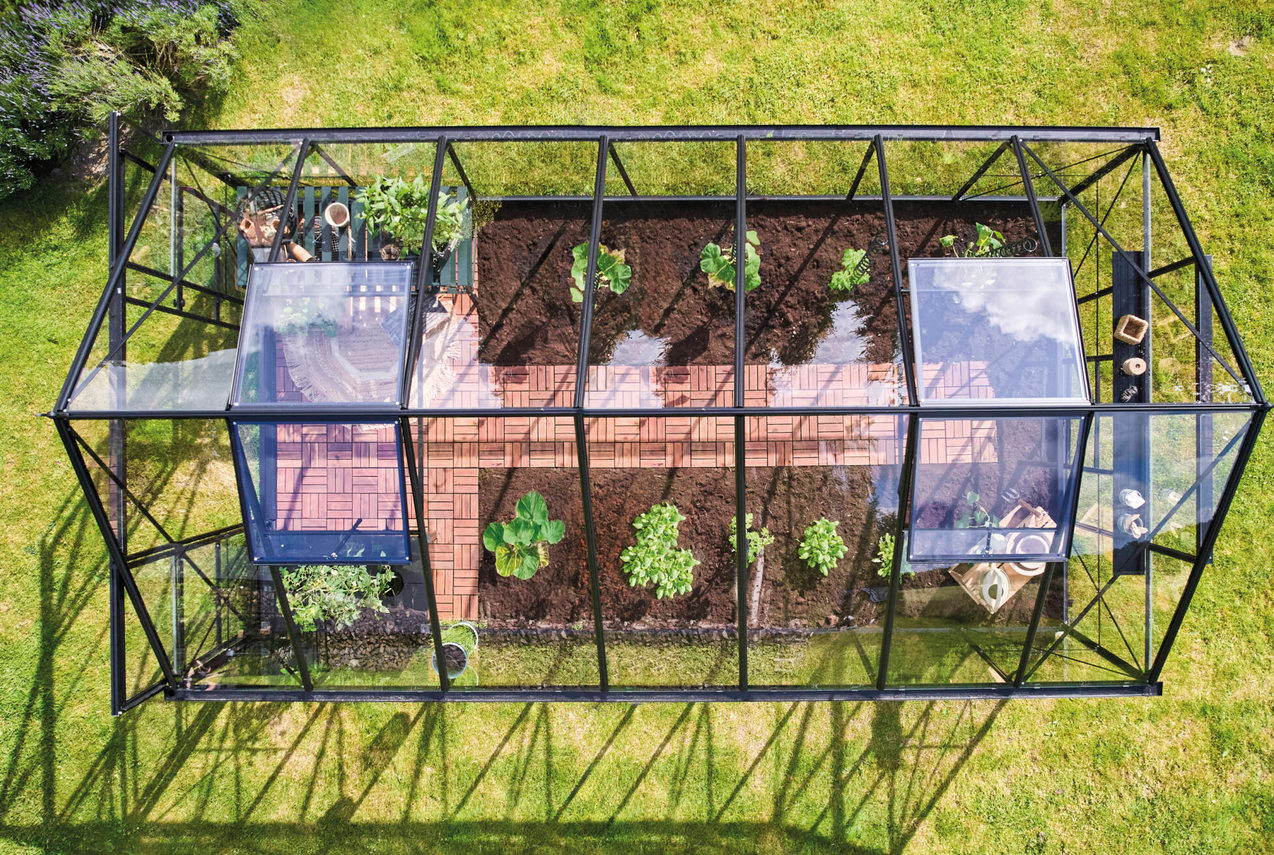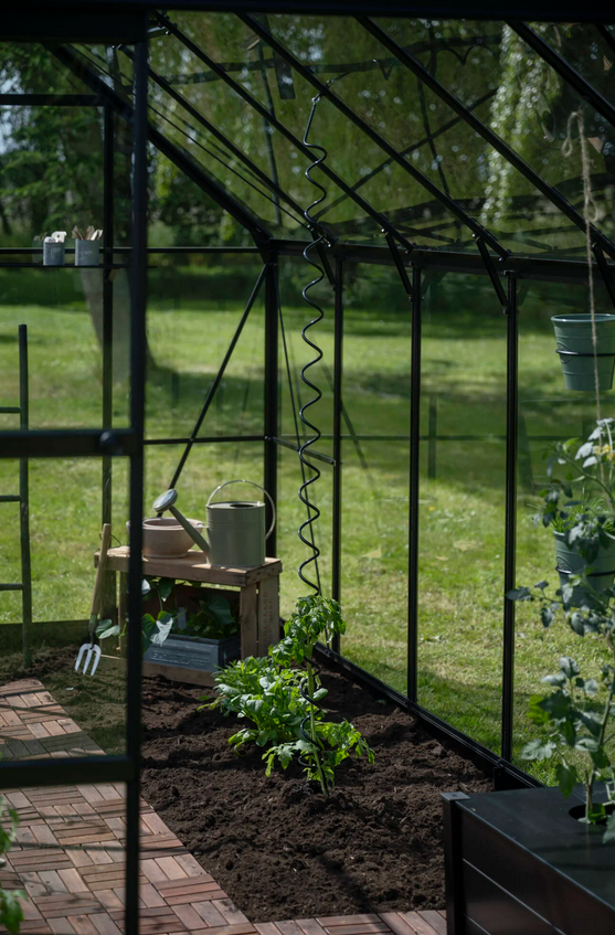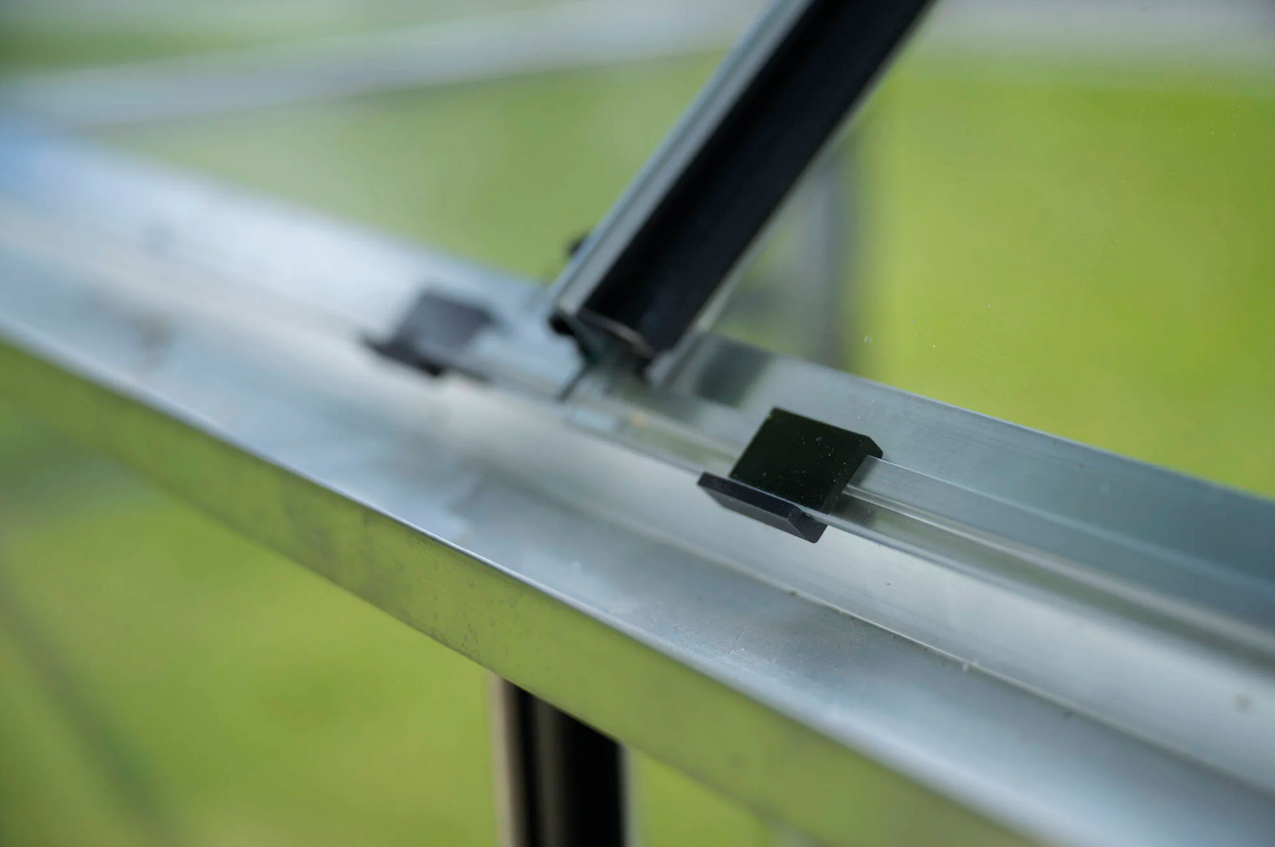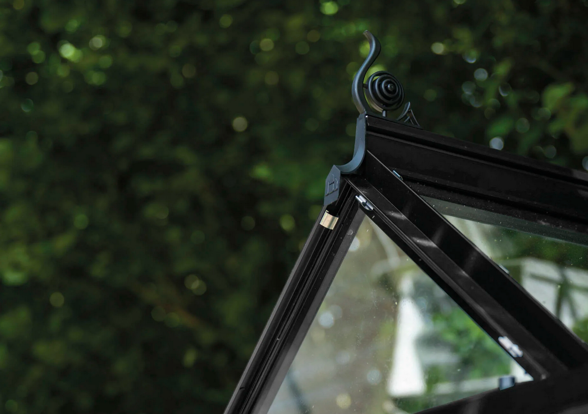 Konstrukcja szklarni wykonana jest z aluminium oraz wypełniona szkłem hartowanym o grubości 3 mm co gwarantuje trwałość, bezpieczeństwo i estetyczny wygląd na długie lata. Szyby mocowane są na gumowych uszczelkach oraz przypinane plastikowymi listwami. Profile aluminiowe malowane proszkowo na elegancki czarny kolor sprawiają, że szklarnia prezentuje się nowocześnie i doskonale komponuje się z otoczeniem ogrodu.