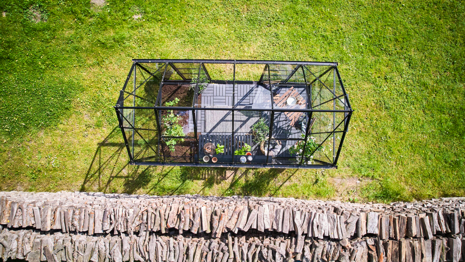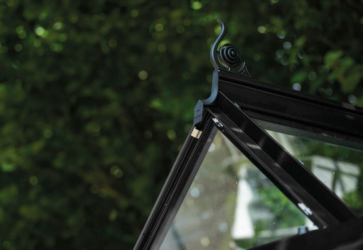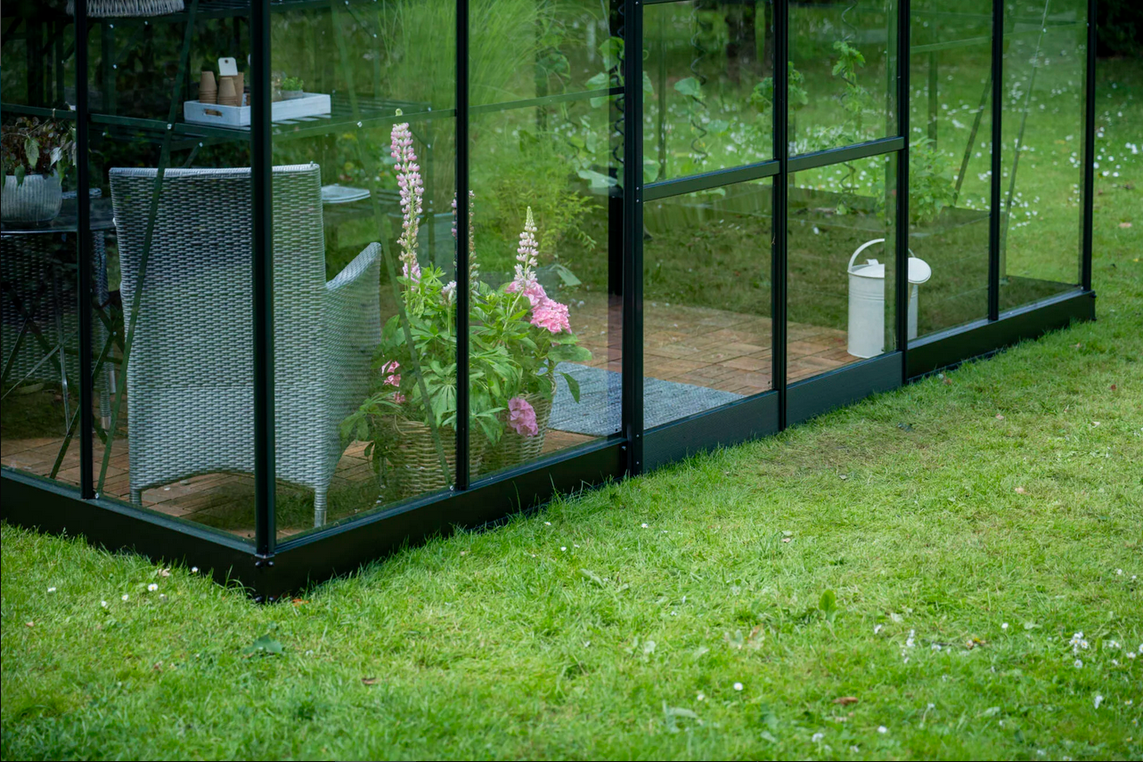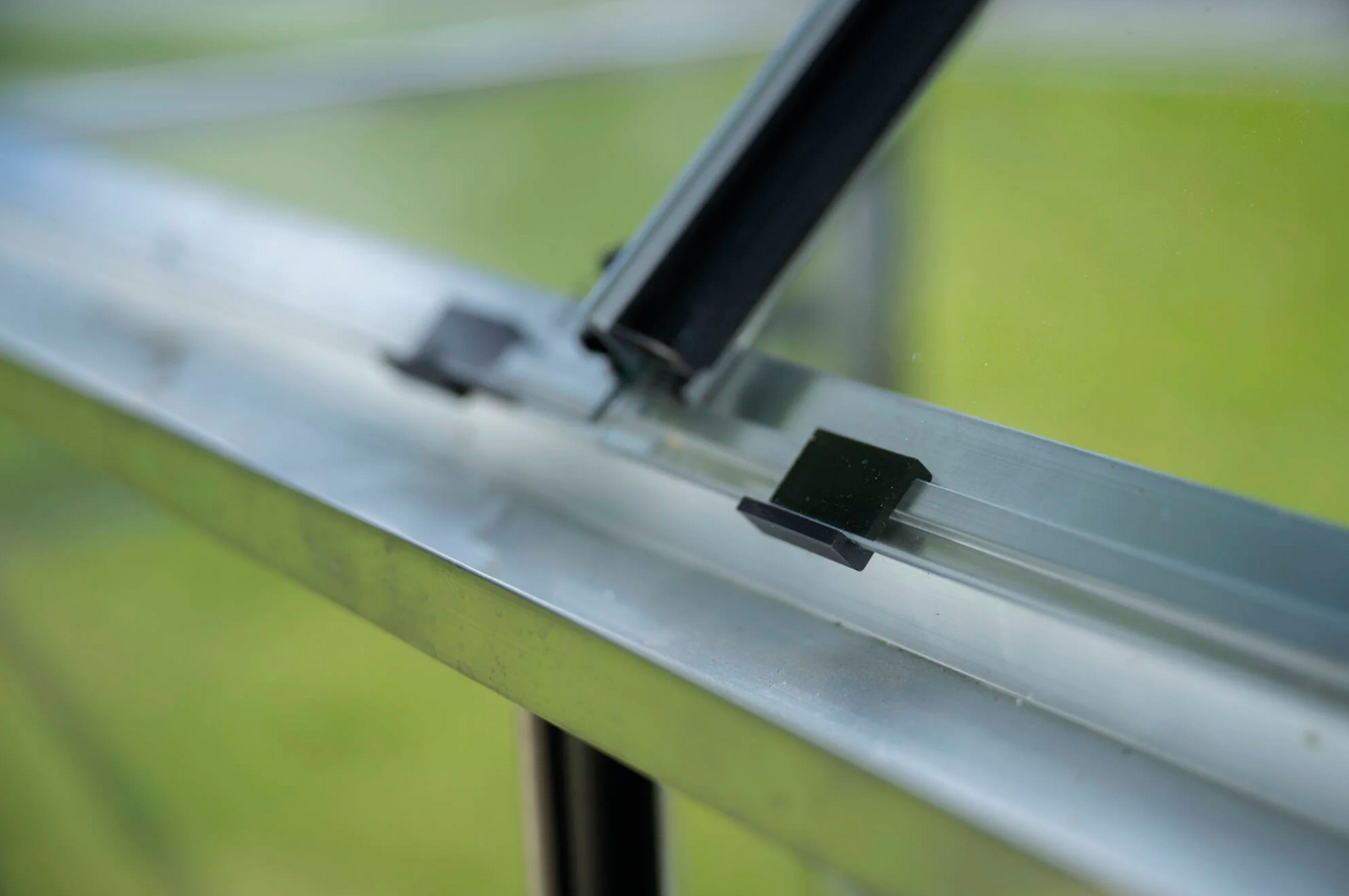 Konstrukcja szklarni wykonana jest z aluminium oraz wypełniona szkłem hartowanym o grubości 3 mm co gwarantuje trwałość, bezpieczeństwo i estetyczny wygląd na długie lata. Szyby mocowane są na gumowych uszczelkach oraz przypinane plastikowymi listwami. Profile aluminiowe malowane proszkowo na elegancki czarny kolor sprawiają, że szklarnia prezentuje się nowocześnie i doskonale komponuje się z otoczeniem ogrodu.