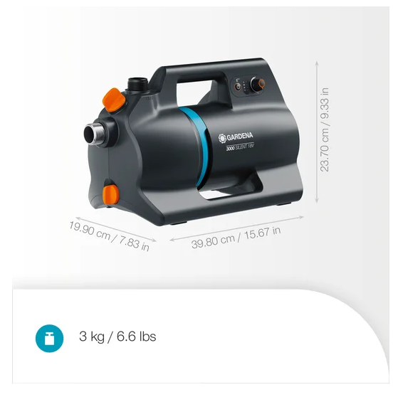 Pompa ssąca oferuje przepływ 3000 l/h i wysokie ciśnienie 3,0 bary, czyli mnóstwo wody do nawadniania i większości typowych prac ogrodowych. Dzięki zasilaniu akumulatorowemu tę potężną pompę może umieścić w dowolnym miejscu, zapewniając niezawodne doprowadzanie wody ze studni, cystern lub zbiorników na deszczówkę.